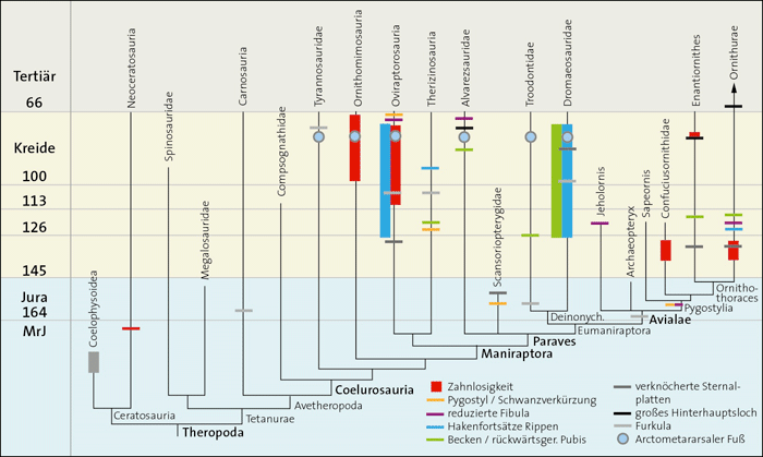 In einer Reihe von Übersichtsartikeln des letzten Jahrzehnts wird darüber hinaus behauptet, dass auch nachvollziehbar sei, dass die typischen Vogelmerkmale schrittweise in Dinosaurier-Vorläufer-Gruppen entstanden seien. Eine genauere Analyse zeigt jedoch, dass die Verhältnisse sehr viel komplizierter sind: Zahlreiche Vogelmerkmale kommen zwar in unterschiedlichen Dinosaurier-Gruppen der Theropoden vor, aber es muss in vielen Fällen von einer konvergenten und damit von den Vögeln unabhängigen Entstehung dieser Merkmale ausgegangen werden (Junker 2019), meist sogar mehrfach, und das oft in Gattungen, die deutlich jünger sind als die ältesten Vogelgattungen. Mit anderen Worten: Die Vogelmerkmale bei Dinosauriern passen in vielen Fällen weder im Cladogramm* noch stratigraphisch* als Vorläufermerkmale (Abb. 2).