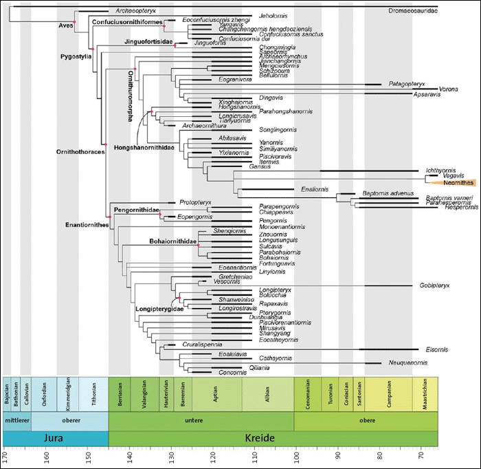 Während im Oberjura voll befiederte Gattungen eher dünn gesät sind, sind in der Unterkreide vor allem ab dem Aptium (ca.126–113 Millionen radiometrische Jahre [MrJ]) sehr viele Vogelgattungen fossil überliefert. In einer aktuellen Überblicksarbeit haben Wang et al. (2021) ein Cladogramm (Ähnlichkeitsbaum) der im Jura und in der Kreide fossil überlieferten Vogelgattungen veröffentlicht. In diesem Cladogramm ist auch angegeben, in welchen Schichten die Fossilfunde überliefert sind (Abb. 3). Schon ein flüchtiger Blick zeigt, dass ein Großteil der kretazischen* Gattungen in der Unterkreide nur im Aptium fossil vertreten ist und dass sehr viele Gattungen annähernd gleichzeitig auftreten. Das gilt insbesondere für Vertreter der beiden Großgruppen der Enantiornithes* (Gegenvögel) und Ornithuromorpha* („Vogelschwänze“). Darauf weisen auch Wang et al. (2021,1) hin: Bereits „kurz nach der Abspaltung von anderen Theropoden im späten Jura diversifizierten die Vögel des Mesozoikums in zwei Hauptgruppen – die Enantiornithes und die Ornithuromorpha“. Ihre Ergebnisse zeigen, dass diese beiden Hauptgruppen der Vögel des Mesozoikums in einem diskreten Merkmalsraum unterscheidbar sind. Beide Gruppen werden als Ornithothoraces* („Brustbein-Vögel“) zusammengefasst.
