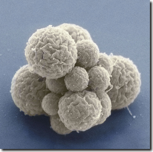 Abb. 1: Rasterelektronenmikroskopische Aufnahme von Mycoplasma mycoides JCVI Syn 3.0, das gentechnisch mit dem kleinsten Genom aller selbstreplizierenden Organismen 2016 am J. Craig Venter Institute hergestellt wurde. Vergrößerung: ca. 50.000-fach. (Science Photo Library / Deerinck, Thomas / NCMIR)