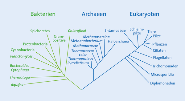Ein widerspruchsfreier Stammbaum aller Lebewesen – seit der Zeit Darwins ist das der Traum aller Befürworter der Evolutionslehre. Im Idealfall sollten Analysen verschiedener Merkmale der untersuchten Organismen – von der Anatomie bis zur Genetik – zu denselben Ähnlichkeitsbeziehungen führen und so eine stimmige Stammbaumrekonstruktion ermöglichen. Angesichts vieler Schwierigkeiten mit unerwarteten Konvergenzen* im anatomischen Bereich und „schockierenden Homologien“ auf der genetischen Ebene rückt dieses Ziel schon bei höheren Lebewesen in weite Ferne (Braun 2012). Doch das eigentlich noch größere Problem befindet sich an der Wurzel des erhofften Stammbaums. Die Wurzel des Stammbaums repräsentiert die „frühe Evolution“, wo sich die Aufspaltung in die drei Domänen des Lebens Archaea, Bakterien und Eukaryoten* abgespielt haben soll (Woese 1998, Abb. 1). Allerdings gibt es bezüglich der Abstammungsverhältnisse der drei Domänen der Lebewesen noch weit mehr Uneinigkeit als hinsichtlich der angenommenen weiteren Evolution der Eukaryoten (Hug et al. 2016). Übereinstimmung besteht aus evolutionstheoretischer Sicht im Wesentlichen darin, dass Prokaryoten* wegen ihrer vergleichsweise geringeren Komplexität und ihrem Vorkommen im unteren Bereich der Fossilabfolge die ältesten Lebensformen sein sollen. Inzwischen mehren sich aber Stimmen, die die Eukaryoten näher zu den Archaeen rücken, da sie angeblich von diesen abstammen (Doolittle 2020).