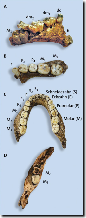 Abb. 1: A Linker Teilunterkiefer eines Kindes mit Milchzähnen und noch nicht durchgebrochener M1-Krone (U.W.101-1400).