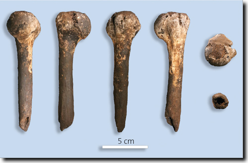 Abb. 3: Rechtes Schlüsselbein U.W. 102a-021 aus der Lesedi-Kammer. Links Ansicht von (v. o. n. u.) oben, vorn, hinten und unten. Rechts Ansicht von (oben) innen und (unten) außen. (Aus Hawks et al. 2018, CC BY 4.0)