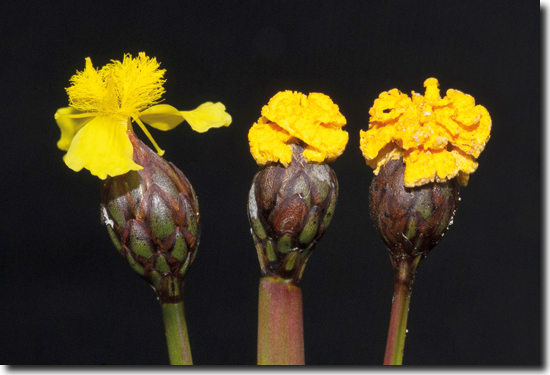 Abb. 1: Echte Blüte des Gelbgrases Xyris links und zwei Pseudoblüten in zwei Stadien. (Bild: Kenneth J. Wurdack, National Museum of Natural History, Smithsonian Institution, Washington, DC)