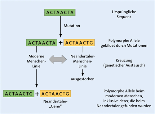 Jeder von uns teilt etwa 1–4 % seiner DNA mit den ausgestorbenen Neandertalern (Sánchez-Quinto 2012). Diese Aussage ist allerdings missverständlich und dadurch irreführend. Denn es ist nicht gemeint, dass moderne Menschen 1–4 % Neandertaler-DNA haben oder dass 1–4 % unserer Gene von Neandertaler-Vorfahren stammen. In Wirklichkeit geht es um Allele derselben Gene. Damit ist gemeint, dass jedes Gen in verschiedenen Ausprägungen vorkommen kann. So trägt jeder einzelne Mensch in seinem Genom (= gesamtes Erbgut) viele einzigartige Allele, die bei anderen Menschen nicht vorkommen, die aber im Genom der Neandertaler und/oder der Denisovaner zu finden sind.