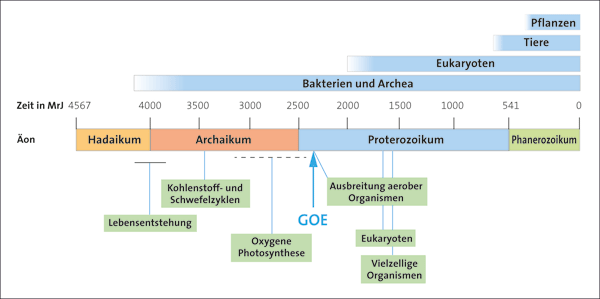 Die Beschreibung dieses Ereignisses wird häufig grob wie in dem folgenden Modell wiedergegeben (Sessions et al. 2009): Die ersten Organismen entstanden vor ca. 4 Milliarden Jahren. Sie lebten in einer sauerstofffreien Atmosphäre und bezogen ihre Energie aus dem Licht oder verschiedenen chemischen Stoffen. Dann entwickelten sich vor ca. 2,4 Milliarden Jahren photosynthetisch aktive Bakterien, die Sauerstoff als Abfallprodukt ihres Stoffwechsels erzeugten. Dies führte dazu, dass die Atmosphäre sich allmählich mit Sauerstoff anreicherte. Dabei sollen zunächst lokale „Sauerstoff“-Oasen entstanden sein und in der Zeit von vor ca. 2,1-1,0 Milliarden Jahren zu einer allmählichen geringfügigen Anreicherung der Atmosphäre mit Sauerstoff geführt haben (ca. 1-2 Vol% der Atmosphäre). Im Verlauf der darauf folgenden 500 Millionen Jahre soll eine durchgreifende, globale Anreicherung der Erdatmosphäre mit Sauerstoff (Oxygenierung) erfolgt sein, so dass etwa der Zustand, in welchem sie heute vorliegt, erreicht wurde (78,08% Stickstoff, 20,95% Sauerstoff, <1% Spurengase: u. a. Kohlendioxid, Methan, Edelgase).2 Die Tiefsee soll jedoch noch bis vor 500 Millionen Jahren überwiegend anoxisch* geblieben und erst später allmählich vom Sauerstoff durchdrungen worden sein. Durch die Konfrontation mit diesem reaktiven Gas sollen die damals lebenden Organismen zu einer immensen Umgestaltung ihrer biochemischen Ausstattung und Lebensweise gezwungen worden sein. Lebensformen, denen das nicht gelungen ist, müssten demzufolge entweder ausgestorben oder in sauerstofffreie Nischen ausgewichen sein. Eine Zusammenfassung des Standardmodells der Evolution in grober zeitlicher Auflösung ist in Abb. 1 dargestellt.