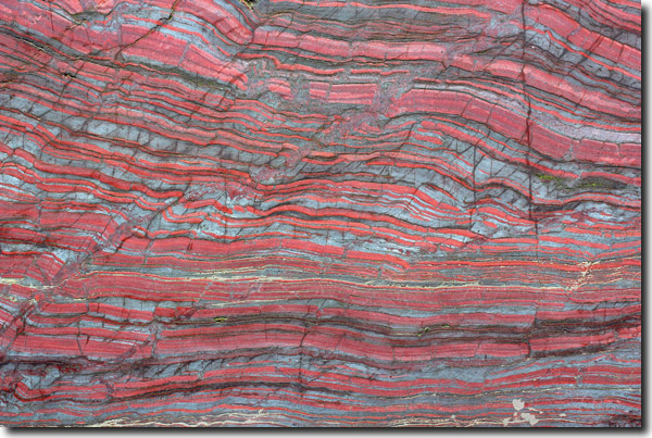 Abb. 2: Amerikanisches Bändereisenerz; die roten „Bänder“ sind angereichert mit Eisen(III)oxid (Fe2O3). (Quelle: farbkombinat, AdobeStock)