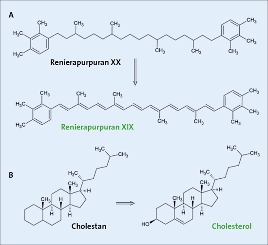 Abb. 5: Strukturformeln zweier Moleküle, die als „molekulare Marker“ (Bezeichnung in schwarzer Schrift) gelten und ihre vermutlichen Vorstufen aus Organismen (Bezeichnung in grüner Schrift). Das Renierapurpurin XIX ist ein Bestandteil von Cyanobakterien, während Cholesterol ein typischer Baustein der Zellwand von Eukaryoten ist.