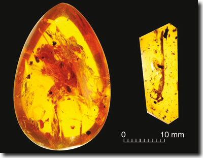 Kürzlich berichteten Daza et al. (2020) von einem in Bernstein eingeschlossenen Kopf eines Amphibiums aus der Familie der Albanerpetontidae ebenfalls aus der Kreide von Myanmar. Die Albanerpetontidae sind eine nur fossil bekannte Amphibienfamilie, die den Schwanzlurchen zugerechnet wird und deren Arten kleinen Salamandern ähnlich sehen (Gardener & Böhme 2008). Der dreidimensional erhaltene Schädel ist von der Schnauzenspitze bis zum Hinterkopf 12,2 mm lang. Die Autoren schätzen die Körperlänge (Schnauze bis Becken) durch Vergleich mit einem anderen fossilen Albanerpetontiden (Celtedens ibericus; McGowan & Evans 1995) auf 52 mm. Das Tier wurde Yaksha perettii1 benannt (Abb. 1).