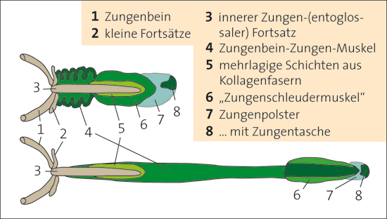 Der Mechanismus der Zungenschleuder von Chamäleons ist intensiv untersucht worden, auch mit dem Ziel, ihn für technische Problemlösungen zu nutzen. Im Aufbau zeigt der Zungenapparat eines Chamäleons, dass unmittelbar auf dem Fortsatz des Zungenbeins mehrere Lagen aus Bändern von Kollagenfasern liegen, die ihrerseits von einem Muskelschlauch umgeben sind. Zunächst war nicht klar, wie das Chamäleon seine Zunge mit einer Geschwindigkeit von bis zu 500 m s-1 in Richtung des erspähten Beutetiers abschießen kann, denn allein mit der von den vorhandenen Muskeln gelieferten Energie ist eine solche Beschleunigung nicht zu erreichen. Beobachtungen und entsprechende Modellversuche haben gezeigt, dass der Muskelschlauch den hep nicht komplett bedeckt, sondern der hep zur Mundöffnung hin noch aus dem Muskelschlauch herausragt. (Weiteres, über dem Muskelschlauch liegendes Zungengewebe umschließt den hep vollständig und mündet in der Zungenspitze, dem Zungenpolster.)