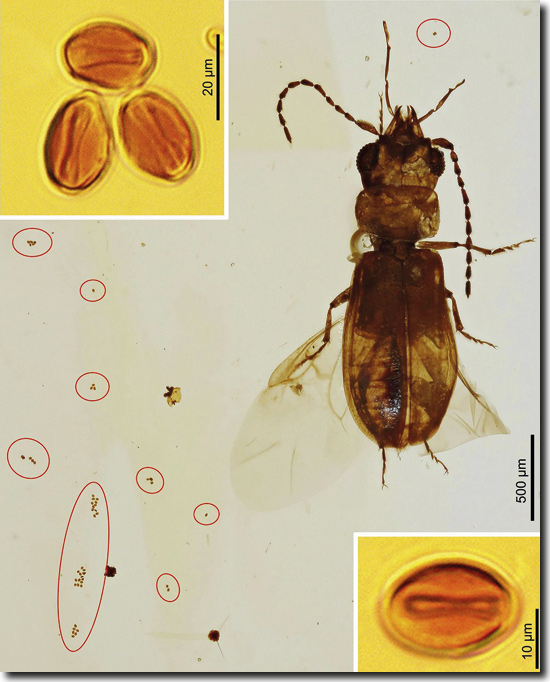 Abb. 1: Pollenkörner von Palmfarnpflanzen in unmittelbarer Nähe des Käfers Cretoparacucujus cycadophilis, der Merkmale zur Pollenverbreitung aufweist. (Aus Cai et al. 2018, mit freundlicher Genehmigung)