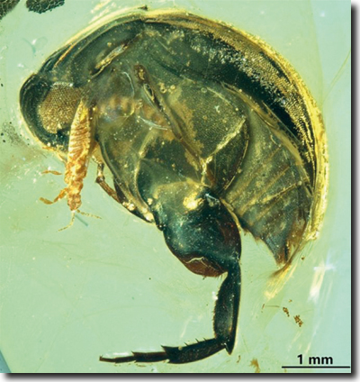 Ein internationales Team von Fachleuten beschreibt Inklusen – also Einschlüsse in einem Stück fossilen Harzes – aus dem Norden Myanmars, dessen Vorkommen in die mittlere Kreide gestellt wird. Das Stück wurde für die mikroskopische Untersuchung entsprechend zugeschnitten und die Oberfläche poliert. Zunächst dokumentieren und beschreiben Cai et al. (2018) einen Käfer, der ohne Fühler eine Körperlänge von etwas mehr als 2 mm hat. Aufgrund seiner Merkmale ordnen ihn die Autoren als neubeschriebene Art der Familie Boganiidae zu (ein deutscher Name dafür ist nicht gebräuchlich). Vertreter der Boganiidae zeichnen sich vor allem durch besondere Merkmale im Kopfbereich und speziell der Mandibeln (Kauladen) aus, die auf der Oberseite spezifische, mit Härchen (Setae) besetzte Vertiefungen aufweisen. Aufgrund weiterer spezieller Merkmale an den Mundwerkzeugen und Beinen kann die fossil beschriebene Art einer der beiden heute lebenden Unterfamilien der Boganiidae, nämlich den Paracucujinae zugeordnet werden. Heutige Vertreter von Paracucujinae fressen Pollen und transportieren diese auch in den mit Härchen besetzten Vertiefungen an ihren Mandibeln, um damit Pflanzen zu bestäuben. Einige Vertreter aus Südafrika und Südwestaustralien leben an den männlichen und weiblichen Zapfen von Palmfarnen (Cycadales).Der hier beschriebene Befund deutet darauf hin, dass die Beziehung zwischen Käfern der Paracucujinae und Palmfarnen bereits im Mesozoikum bestand und bis heute unverändert andauert. Diese Aussage wird dadurch unterstrichen, dass Cai et al. nicht nur die typischen Merkmale an dem fossilen Käfer dokumentieren, sondern auch Pollen von Palmfarn in unmittelbarer Nähe des in Bernstein eingeschlossenen Käfers beschreiben. Dieser mit dem Käfer Cretoparacucujus cycadophilus assoziierte Pollen liegt als Aggregat (3–14 Pollenkörner) vor, d. h. er tritt nicht in Form einzelner Pollenkörner auf, die mit dem Wind zur Bestäubung verfrachtet werden könnten. Auch diese Beobachtung unterstützt die mutmaßliche Bestäubung der Palmfarne durch C. cycadophilus.