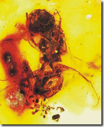 Abb. 3: Biene Melittosphex burmensis aus der Kreide in Myanmar; die Körperlänge beträgt ca. 4 mm und das Tier weist Merkmale auf, die auch für Wespen charakteristisch sind. (Aus Poinar & Danforth 2006) Pollensammelnde Bienen – Fossilien aus der Kreide
