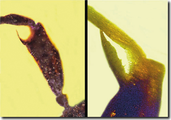 Abb. 4: Links: Der gegabelte Schaft an der Antenne einer zweiten Biene, Discoscapa apicula (Kreide, Myanmar) ist ein einzigartiges und besonderes Merkmal. Rechts: Putzscharte am Vorderbein von D. apicula. (Aus Poinar 2020)