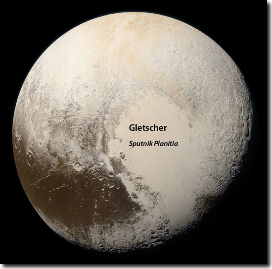 Die Atmosphäre von Pluto besteht zu fast 100 % aus Stickstoff (N2) und die Astronomen gehen davon aus, dass dieser Stickstoff hauptsächlich aus dem Gletscher Sputnik Planitia stammt, siehe Abb. 2.
