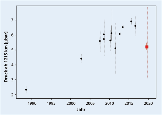 Japanische Astronomen (Arimatsu 2020) überraschen nun mit Beobachtungsdaten, die zeigen, dass sich der Druck der Pluto-Atmosphäre in den letzten drei Jahren um mehr als 20 % verringert haben soll. Abb. 3 zeigt (in schwarz) die früheren Messwerte zusammen mit (in rot) dem nun gemessenen, deutlich niedrigeren Wert. Diese Messungen stammen nicht von der Raumsonde New Horizons, sondern wurden direkt von der Erde aus gemacht. Dazu werden Sternbedeckungen verwendet, dabei zieht Pluto von der Erde aus gesehen vor einem Stern vorbei. Das Licht des Sterns scheint deshalb kurzfristig durch die Atmosphäre von Pluto und die Streuung und spektrale Veränderungen des Sternlichts durch die Atmosphäre des Pluto enthüllen chemische Zusammensetzung, Druck, Temperatur und Ausbreitung der Atmosphäre.
