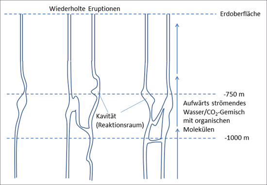 Der Geologe Ulrich Schreiber und seine Kollegen Christian Mayer und Oliver J. Schmitz haben für die Fragestellung des Lebensursprungs eine ungewöhnliche Herangehensweise gewählt. Gemäß ihrem Konzept sollen erste Vorstufen des Lebens nicht auf der Erdoberfläche entstanden sein, sondern tief darunter. Die drei Wissenschaftler haben die Hypothese aufgestellt, dass Schritte der Lebensentstehung in Poren und Kavitäten* ca. 750 m – 1000 m unter der Erde in einem Gemisch aus Wasser und CO2 stattgefunden haben können (Mayer et al. 2017, s. Abb. 1). Als wesentliche Verbesserungen gegenüber der vermuteten Entstehung erster Zellen in einem „warmen Tümpel“ an der Erdoberfläche werden folgende Aspekte angeführt: