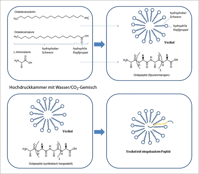 Oben Das Gemisch aus Wasser, CO2, amphiphilen Molekülen (Fettsäure: Octadecansäure, aliphatisches Amin: Octadecanylamin) und L-Aminosäuren bringt bei 120 °C und Drücken von 70–100 bar Vesikel und Peptide einer maximalen Länge von acht Aminosäuren hervor.