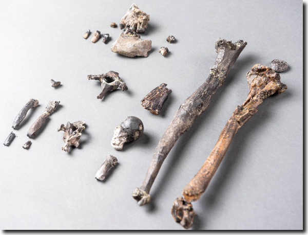 Abb. 1: Die 21 Knochen des Teilskeletts des am vollständigsten erhaltenen (männlichen) Danuvius guggenmosi. https://www.sueddeutsche.de/wissen/danuvius-guggenmosi-allgaeu-menschenaffe-1.4673554
