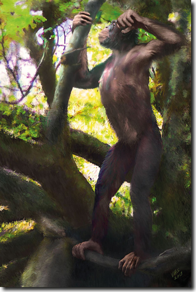 Abb. 2: Darstellung von Danuvius guggenmosi durch den Künstler Velizar Simeonovski im Auftrag von Madelaine Böhme und ihren Kollegen. https://www.sueddeutsche.de/wissen/menschenaffe-danuvius-allgaeu-tuebingen-1.4671000