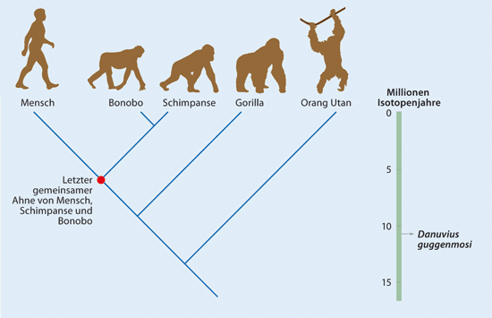 Aus dieser Fortbewegung sollen sich dann die spezialisierteren Bewegungsformen entwickelt haben: Knöchelgang der Afrikanischen Großaffen (Gorilla, Schimpanse), das reine Schwingen des Orang-Utans und das gewohnheitsmäßige zweibeinige Schreiten des Menschen. Abb. 3 zeigt den evolutionären Stammbaum von Mensch und Großaffen und die zeitliche Position des neuen Menschenaffen Danuvius guggenmosi.