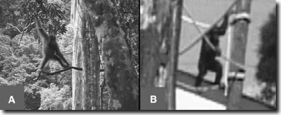 Abb. 4: Bipedie des Orang-Utans (Pongo) und des Schimpansen (Pan) beim Klettern. A Mit den Armen unterstützte Bipedie mit gestreckten Knien beim Orang-Utan. B Mit den Armen unterstützte Bipedie mit gebeugten Knien beim Schimpansen. (Nach Thorpe et al. 2007, Abb. 1, A und D)