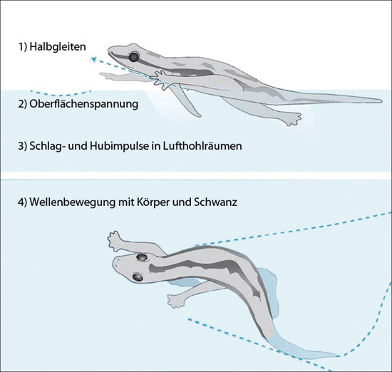 Abb. 1: Geckos nutzen mehrere Mechanismen, um über die Wasseroberfläche zu laufen. (Nach Nirody et al. 2018, CC BY-NC-ND 4.0)