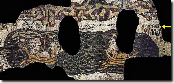Abb. 3: Totes Meer und Umgebung. Ausschnitt aus der Mosaikkarte der St.-Georgs-Kirche in Madaba (Jordanien). Die Karte entstand Mitte des 6. Jahrhunderts n. Chr. und wurde 1894 wiederentdeckt. Links (Norden) die Einmündung des Jordan, rechts (im Südosten) der Ort Balak/Zoora (Pfeil) mit Dattelpalmen und Militärlager, darüber (östlich) in der Bergen das „Lot-Heiligtum“, eine im 5.–6. Jahrhundert über der mutmaßlichen Höhle Lots errichtete Pilgerstätte mit Basilika. Die Verortung von Balak/Zoora geht auf das Onosmatikon von Eusebius zurück. Abdruck mit freundlicher Genehmigung von Prof. Eugenio Alliata, OFM; Studium Biblicum Franciscanum (Jerusalem, Israel).