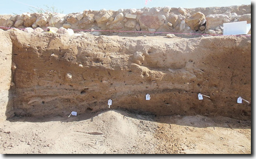 Abb. 5: Graue Aschenlage entlang der Markierungen 1 bis 5, Tall el-Hammam. Die Dicke der Lage nimmt von rechts nach links zu, die Neigung ist eine Folge von Setzung und Kompaktion. Die Zusammensetzung aus Asche, zerbrochenen und zersetzten Lehmziegeln und zahlreichen Keramikbruchstücken kann stark variieren („mixed matrix“). Foto/Credit: Tall el-Hammam Excavation Project, Trinity Southwest University (Abdruck mit freundlicher Genehmigung).