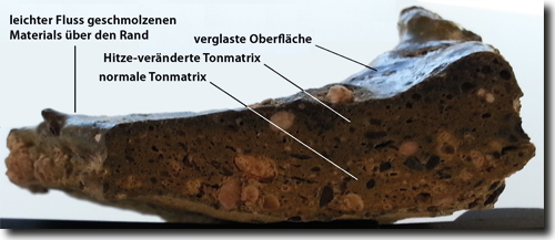 Abb. 7: Tonscherbe von Tall el-Hammam, Oberfläche mit thermischer Einwirkung. Die Scherbe (MB2-datiert) ist im Mittel 5 mm dick; Beschriftung in Übersetzung gemäß Silvia et al. (2018), ihre Abbildung 4. Foto/Credit: Phillip J. Silvia, PhD, Director of Scientific Analysis, Tall el-Hammam Excavation Project, Trinity Southwest University (Abdruck mit freundlicher Genehmigung).
