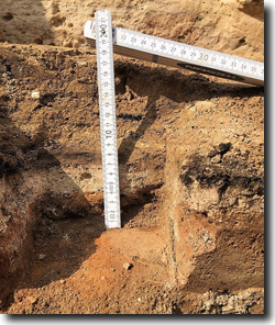 Abb. 6: Dunkle Aschenlage (Zollstock-Position: 7–8 cm), hier hauptsächlich aus Holz, über einem hellen, kompaktierten Horizont (Zollstock-Position: 4–7 cm); Tall el-Hammam. Silvia et al. (2018) bezeichnen die Lage als „MB2-Zerstörungs-Lage“. Zur Periode MB2 oder MBZ II s. Tab. 1. Foto/Credit: Tall el-Hammam Excavation Project, Trinity Southwest University (Abdruck mit freundlicher Genehmigung).