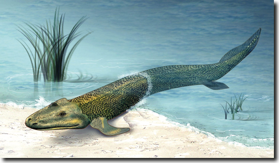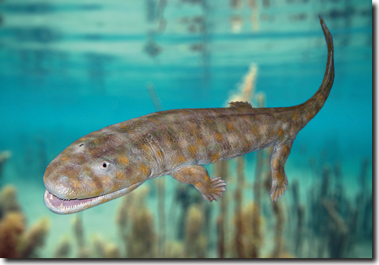 Als im Jahr 2006 die Entdeckung von Tiktaalik – scheinbar halb Fisch, halb Vierbeiner – veröffentlicht wurde, schien alles klar zu sein: Der mutmaßliche evolutive Übergang von Fischen zu Vierbeinern (Tetrapoden) war glänzend belegt. Denn Tiktaalik aus dem Oberdevon von Nordkanada weist eine ausgeprägte Kombination aus fischtypischen Merkmalen und typischen Tetrapodenmerkmalen auf und wurde in Rekonstruktionen als ein Zwischenwesen dargestellt, das dabei ist, das Land zu erobern (Abb. 1). Fischartig sind z. B. die großen Kiemenhöhlen, die ausgeprägten Flossenstrahlen, die Schuppenhaut, der Unterkiefer und der Gaumen. Dagegen sind das verkürzte Schädeldach, der flache Schädel mit nach oben gerichteten Augen, die Ohrregion, die Beweglichkeit der Halsregion, das Fehlen von Kiemendeckeln, der relativ kräftige Brustkorb mit überlappenden Rippen, der flache Körperbau und der Besitz eines Handgelenks Merkmale, die eher zu Tetrapoden weisen. Was für die Entstehung der Vögel der Urvogel Archaeopteryx ist, war nun für die Entstehung der Tetrapoden daher für manche Forscher die Gattung Tiktaalik.