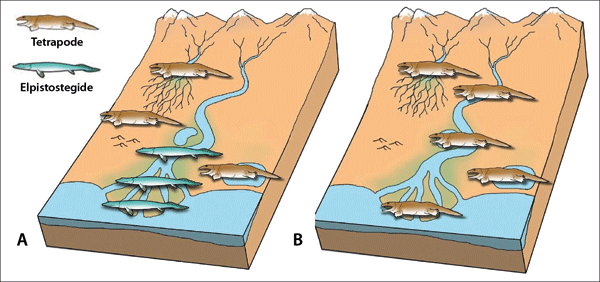 Abb. 3: Blockdiagramme idealisierter devonischer Landschaften, die die Verteilung von Elpistostegiden und Tetrapoden zeigen, die aus fossilen Daten abgeleitet wurden. A Mitteldevon bis frühes Frasnium (unteres Oberdevon): Elpistostegiden besetzen die unteren Teile von Flusssystemen, während Tetrapoden in den oberen Teilen von Flusseinzugsgebieten, in Sabkha-Umgebungen und in Küstenseen vorkommen. B Vom späten Frasnium bis zum Famennium (oberes Oberdevon): Die Elpistostegiden sind verschwunden und alle Lebensräume sind von Tetrapoden besetzt. (Aus Ahlberg 2018; CC BY 4.0) Ein neues Szenario
