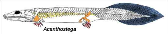 Die abgeleiteten Merkmale des Körperbaus von Elpistostegiden und devonischen Tetrapoden stünden im Zusammenhang mit der Bewegung auf dem Untergrund, der Stützung des Gewichts und dem Sehen in der Luft, seien also Ausdruck von „terrestrischer Kompetenz“ (Fähigkeit zum Leben auf dem Land), während die Beibehaltung von Seitenlinienkanälen, Kiemen und Flossenstrahlen zeige, dass sie gleichzeitig eng mit dem Wasser verbunden waren. Ahlberg präsentiert vor diesem Hintergrund eine neue Hypothese, wonach einige devonische Gattungen und eine Reihe von Tetrapoden des Karbons, die bislang als sekundär wasserlebend interpretiert wurden, nicht von landangepassten Formen abstammen würden, sondern wiederholt von Formen ausgehend evolviert seien, die noch an das Wasser gebunden waren. Zu diesen Formen rechnet er auch die Gattung Acanthostega (Abb. 4), die wie Tiktaalik häufig als Bindeglied zwischen Fischen und Vierbeinern gewertet wurde. Acanthostega besaß zwar acht Finger an seinen Flossen, war aber vollständig wasserlebend und wird wie Tiktaalik als lauernder Räuber in der Ufervegetation rekonstruiert. Statt auf dem Weg zum Landleben sieht Ahlberg (2018, 2) Acanthostega also auf einem Weg in umgekehrter Richtung: von einer semiaquatischen zurück zu einer vollaquatischen Form.