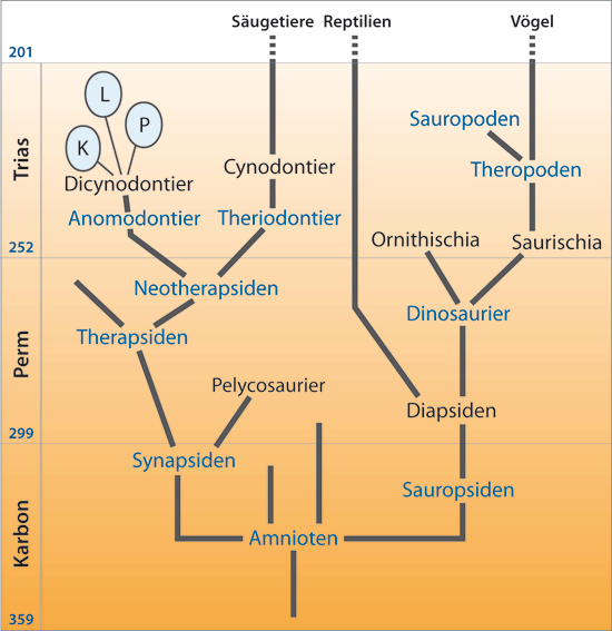 Demnach kennzeichnen zwei große Entwicklungslinien die Amniota. Ein Zweig beinhaltet die Reptilien/Sauropsiden, zu denen der Großteil der fossilen und alle heutigen Echsen zählt. Der andere Zweig umfasst die Synapsiden, aus denen die Säugetiere hervorgegangen sein sollen. Es sind nicht alle Gruppen genannt, sondern die, welche für die Abstammungsverhältnisse besonders wichtig sind. Die im Text erwähnten Gruppen sind farblich hervorgehoben. K Kannemeyeria, L Lisowicia bojani, P Placerias. Dinosaurier und Säugetiere – ein systematischer Überblick