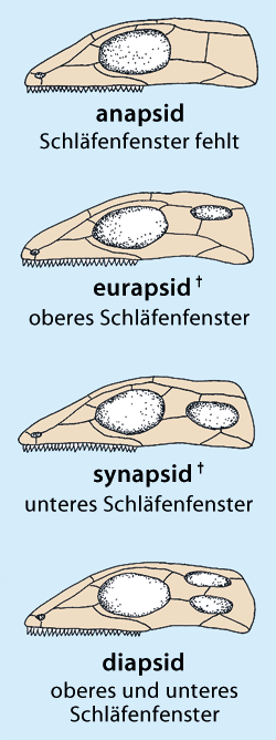 3 Tiere mit einem charakteristischen Knochenfenster an der hinteren Schädelseitenwand, zu denen die sehr umfangreiche Ordnung der Therapsiden gehört, welche die Säugetiere einschließt (vgl. Abb. 2).