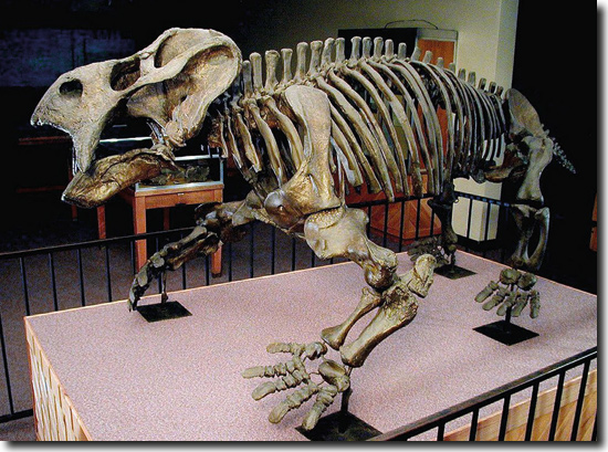 Abb. 3: Der Dicynodontier Placerias mit rechtwinklig zum Körper angeordneten Oberarmknochen und senkrecht unter dem Körper stehenden Hinterextremitäten. (Rainbow Forest Museum, gemeinfrei) Ein überraschender Fund