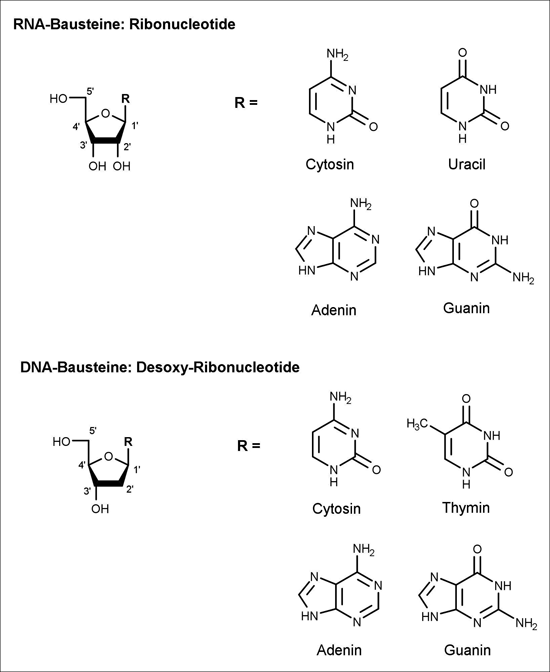 Abb. 1: Strukturformeln der Bausteine der RNA (Ribonukleotide) und der DNA (Desoxy-Ribonukleotide). Die zwei strukturellen Unterschiede zwischen den Bausteinen sind die fehlende OH-Gruppe an der 2‘-Position bei den DNA-Bausteinen und das Thymin anstelle des Uracil als eine der kanonischen Nukleobasen. Damit also Desoxy-Ribonukleotide hergestellt werden können, muss die 2‘-OH Gruppe der Ribonukleotide entfernt werden. In Organismen ist dafür das Enzym Ribonukleotid-Reduktase zuständig.