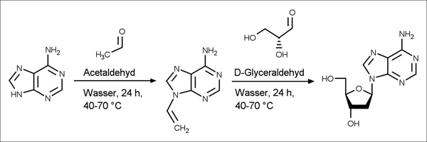 Abb. 2: In der Arbeit von Trapp et al. untersuchter Reaktionsweg ausgehend von Nukleobasen, Acetaldehyd und D-Glyceraldehyd. Hier ist der Reaktionsweg exemplarisch am Adenin gezeigt. Die Reaktion ergibt aber ebenso auch Desoxy-Nukleotide bei Verwendung der anderen drei Nukleobasen. Die Ausbeuten der Reaktionen waren mit unter einem Prozent (Adenosin, Guanosin, Thymidin) bzw. 2,5 % für Cytidin recht niedrig.