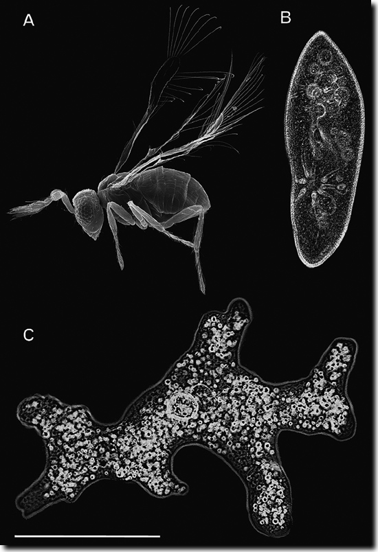 Abb. 1: Miniaturwespe im Größenvergleich mit einem Pantoffeltierchen und einer Amöbe.