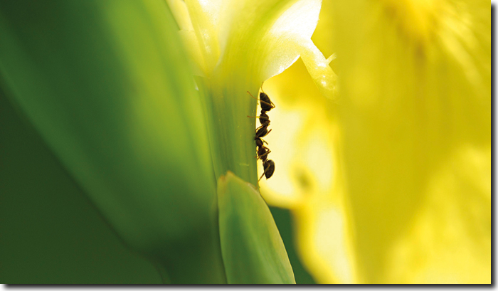 Abb. 1: Zwei Schwarze Wegameisen (Lasius niger) bei gegenseitiger Fütterung auf einer Iris-Blüte. (Python (Peter Rühr) CC BY 3.0)