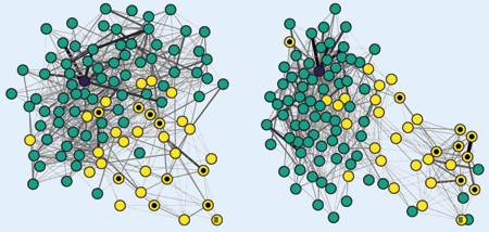 Abb. 2: Netzwerk von Ameisenkontakten vor (links) und ein Tag nach einer Infektion. Jeder Punkt stellt eine Ameise dar. Schwarze Punkte stehen für infizierte Ameisen, pink ist die Königin, gelb sind die Außenarbeiter. (Aus Stroeymeyt et al. 2018, mit freundlicher Genehmigung)