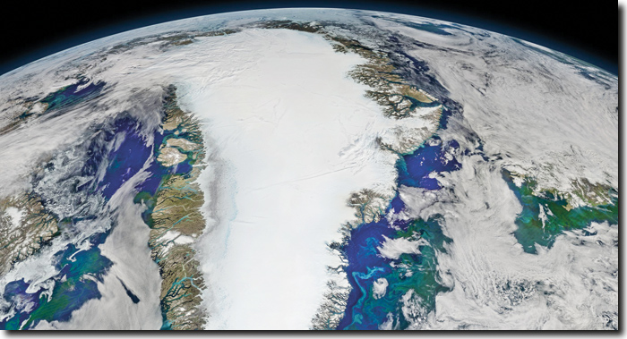 Abb. 1: Satellitenaufnahme von Grönland (NASA, 27. Juli 2016), Grönland ist Namensgeber für die Grönlandium-Stufe.