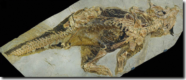 Abb. 1: Psittacosaurus mit langen, borstenartigen Auswüchsen im Schwanzbereich. (Senckenberg-Museum, Vinther et al. 2016, CC BY 4.0)