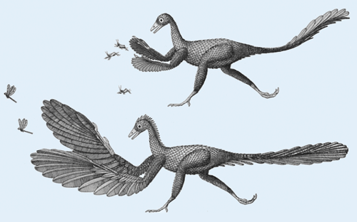• Für ein zweibeiniges Wirbeltier wäre es kein Vorteil, seine Vorderextremitäten auszubreiten, während es rennt. Denn für ein Flattern wäre das zwar günstig, jedoch kontraproduktiv in Bezug auf Luftwiderstand (Homberger & De Silva 2000, 568).1