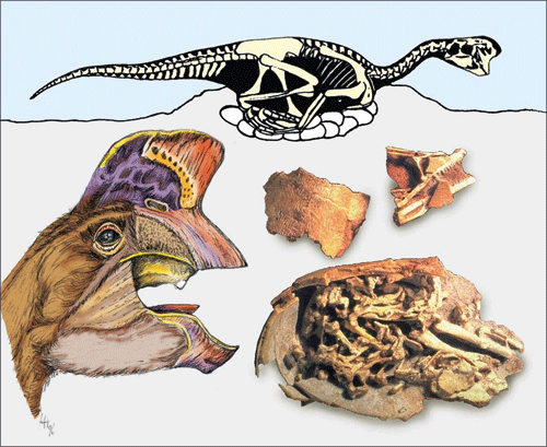 Abb. 5: Mehrfach wurden Nester von Dinosauriern gefunden. Funde von auf ihren Nestern sitzenden Oviraptoren (A; B Kopf eines Tieres) lieferten Hinweise auf schnelle, gewaltsame Verschüttung. Selbst in den Eiern wurden Embryonen fossilisiert (C). (Nach Norell et al. 1994; Paul in Weishampel 1995 und Norell et al. 1995, mit freundlicher Genehmigung, © American Association for the Advancement of Science)