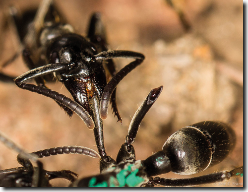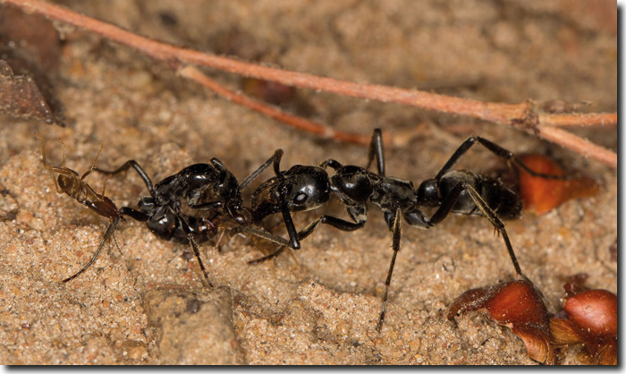 Abb. 2: Eine Ameise der Art Megaponera behandelt die Wunde eines Kameraden im Nest. (© Erik T. Frank, mit freundlicher Genehmigung; Bild: ETF89, CC BY-SA 4.0)