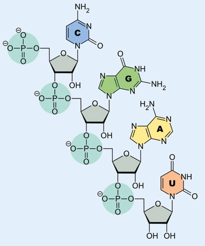 Abb. 1: Ausschnitt aus einem RNA-Molekül mit dem Rückgrat aus Ribose (grau) und Phosphat (türkis), sowie den vier typischen Basen: Cytosin, Guanin, Adenin und Uracil. (wikipedia.org)