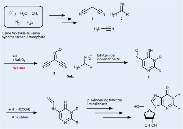 Die Nitrosopyrimidinverbindungen (4) werden in weiteren Reaktionsschritten zunächst in verdünnter Salzsäure hydrolysiert. (Hydrolysiert man die Verbindung 4 mit einer Methylthiogruppe [R = SMe] in Gegenwart von Aminen, so entstehen Zwischenstufen, die zu nicht typischen RNA-Bausteinen führen, sondern zu sogenannten nicht kanonischen* RNA-Basen.) Die durch Hydrolyse erzeugten Aminogruppen können in verdünnter Ameisensäure (HCOOH) in Gegenwart von metallischem Nickel (Ni)- oder Eisenpulver (Fe) durch Anhängen einer Formylgruppe aktiviert werden. Ni und Fe bilden unter den Reaktionsbedingungen Ni2+- bzw. Fe2+-Ionen. Die so erhaltenen Zwischenstufen können als Feststoffe mit Ribose umgesetzt werden. Unter basischen Bedingungen kann der Ringschluss zum Purinsystem erfolgen. Auf diese Weise können im Labor Nukleoside synthetisiert werden. Dafür sind sehr viel leistungsfähigere Synthesen als die hier beschriebenen bekannt, aber diese sind sehr weit davon entfernt, als Beispiele für präbiotische Vorgänge gelten zu können.
