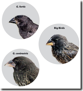 Abb. 1: Die Hybride (rechts) – Big Birds – aus Geospiza fortis und G. conirostris (links). (Aus Wagner 2018, Abdruck mit freundlicher Genehmigung)