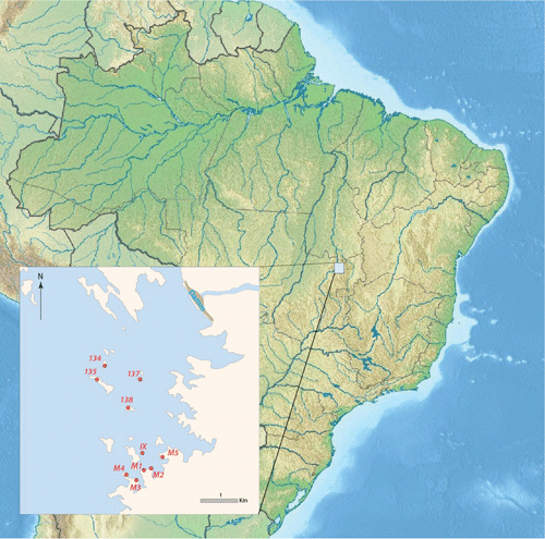 Abb. 3: Die Lage des Lago de Serra da Mesa im Inneren Brasiliens. M1, M2, M3, M4 und M5 sind die Lokalitäten auf dem Festland; I34, I35, I37, I38 und IX sind die Lokalitäten auf den untersuchten Inseln. (Große Karte: CC BY-SA 3.0; Ausschnitt nach Eloy de Amorim et al., 2017, online-Material)